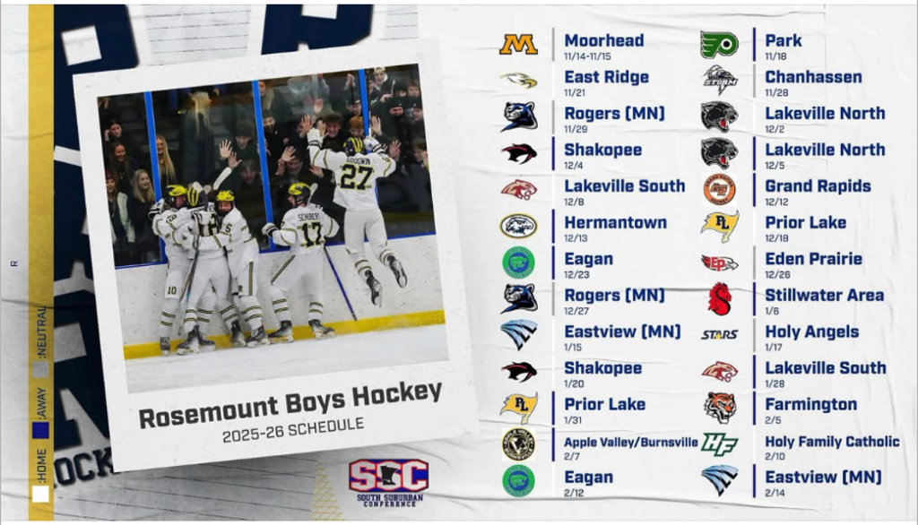 The Rosemount Boys Hockey program gives student athletes the opportunity to represent their school and community, while competing on an athletic team. The coaching staff is committed to providing a positive atmosphere where all athletes can grow and improve their skill.
